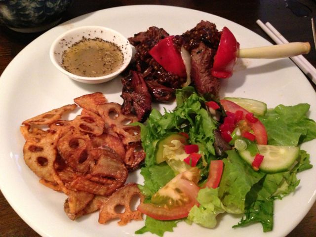 was super. The presentation of the Rendang needs some work in my opinion – the best curry can look like slop when served on a plate, it should be in a bowl which is then placed on the plate. The other main was beef fillet cubes on a lemon grass skewer, served medium-rare with a pepper sauce and lotus root crisps. There wasn’t a bite left which is proof enough that it was good.