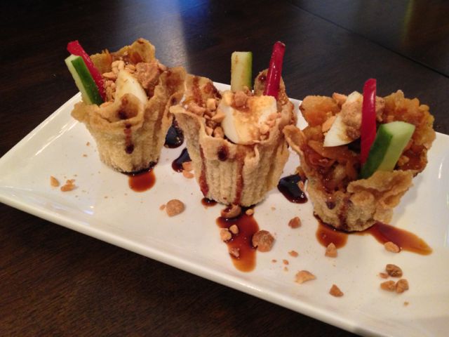 I can’t say I’m familiar with the food from this area of the world, so it was useful to have on hand a knowledgeable waitress. For starters we tried the special, a chicken and prawn dim sum, a dish called “Top Hats”, and Singapore “Carrot Cake”. I loved the savoury carrot cake which is not cake-like at all, it’s made from rice flour and mooli – it was sticky, sweet, spicy, and most importantly, delicious. We also loved the “Top Hats”, wonton pastry cups filled with spiced vegetables, with boiled egg and peanuts on top. An unusual and tasty starter which was great to share.