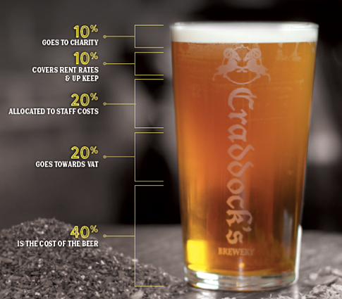 The Good Intent Beer Glass showing percentages that are costs, tax, and profit for charity